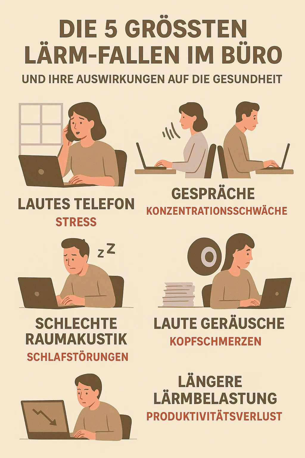 Lärm im Büro ist mehr als nur störend – er ist ein messbarer Produktivitätskiller. Studien zeigen: Bei einem Geräuschpegel über 55 Dezibel sinkt die Konzentrationsfähigkeit um bis zu 50%. In Großraumbüros verstärkt sich dieser Effekt durch den sogenannten Lombard-Effekt: Menschen sprechen in lauter Umgebung automatisch lauter, wodurch der Lärmpegel spiralförmig ansteigt. Die Folgen für Mitarbeiter sind gravierend: erhöhter Stress, schnellere Erschöpfung und eine deutlich höhere Fehlerquote bei komplexen Aufgaben.