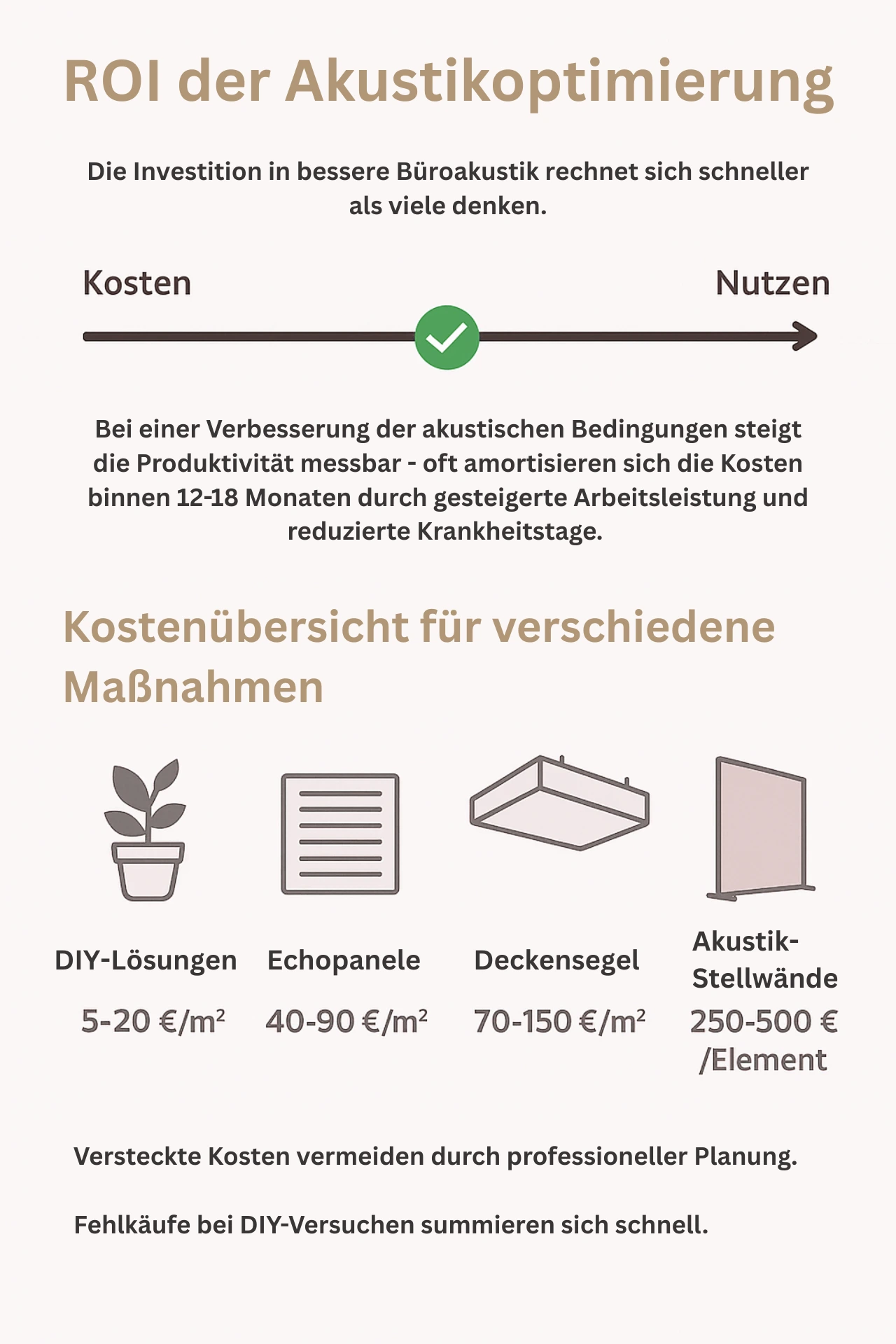 Die Investition in bessere Büroakustik rechnet sich schneller als viele denken. Bei einer Verbesserung der akustischen Bedingungen steigt die Produktivität messbar – oft amortisieren sich die Kosten binnen 12-18 Monaten durch gesteigerte Arbeitsleistung und reduzierte Krankheitstage.