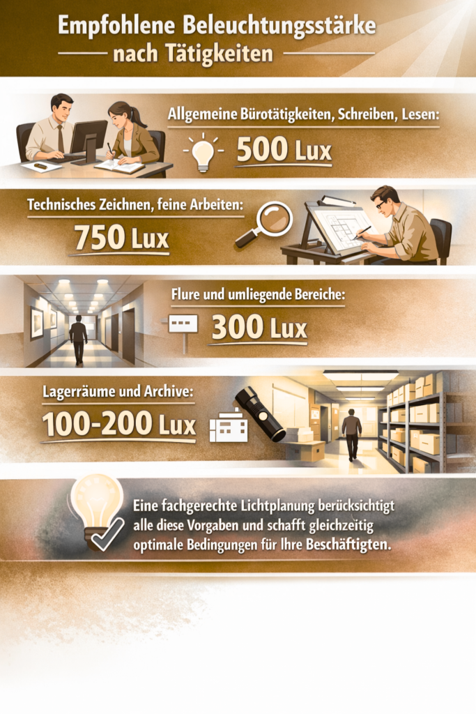 - Allgemeine Bürotätigkeiten, Schreiben, Lesen: 500 Lux