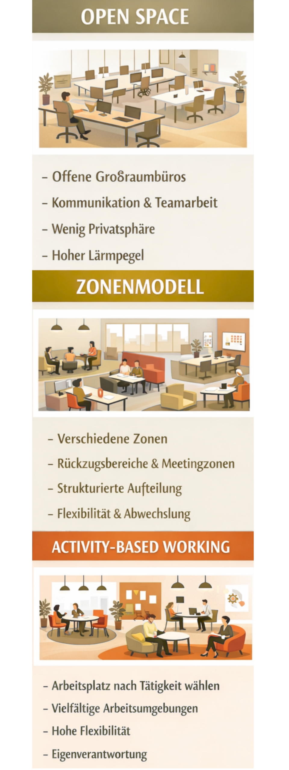 Zonenmodelle bieten eine clevere Lösung: Sie kombinieren offene Bereiche für Austausch mit abgeschirmten Ruhezonen für fokussiertes Arbeiten. Schalldämmende Elemente, durchdachter Schallschutz und verschiedene Raumtypen schaffen eine ausgewogene Arbeitsumgebung.